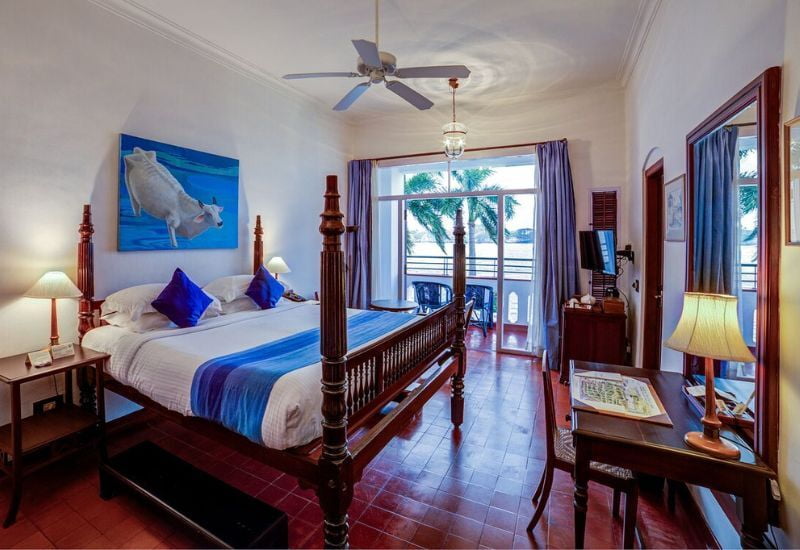 Upon arrival, guests are instantly transported back to colonial India, thanks to the arched wooden ceilings, tiled floors, and traditional punkah fans gently circulating overhead. The walls are decorated with photographs and prints of the historic boatyard and Dutch maritime maps.