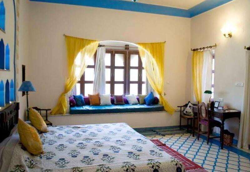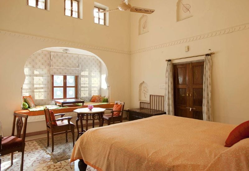 Each of the 11 rooms is uniquely adorned in a traditional manner, featuring vibrant hues, antique furnishings, and characteristic Rajasthani designs. All accommodations overlook the courtyard, with ground floor rooms offering balconies at mezzanine level, while the upper floor rooms boast outdoor seating areas.