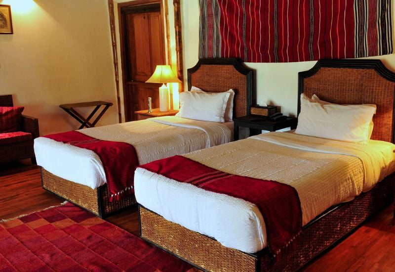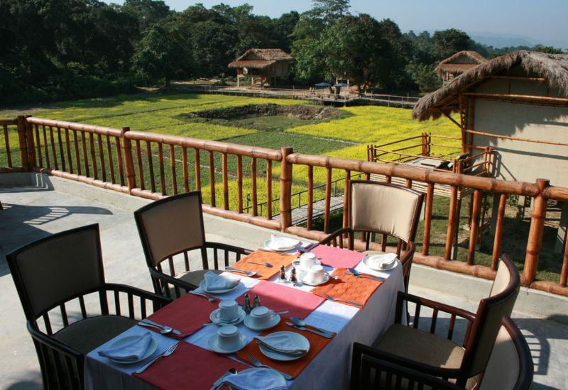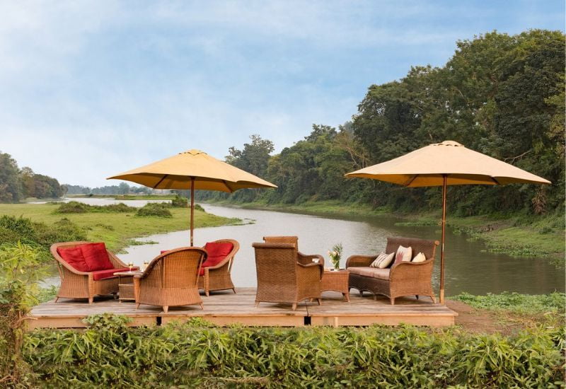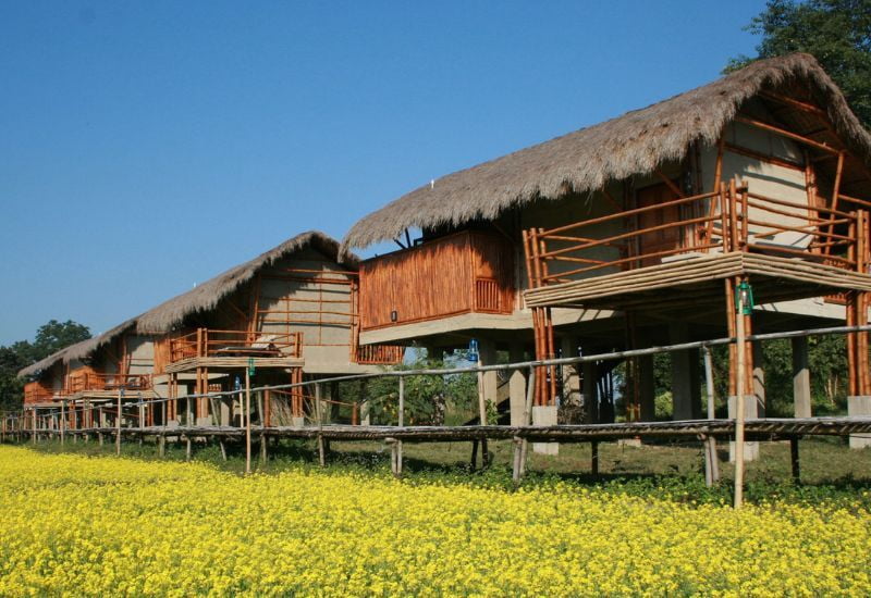 Situated at the periphery of Kaziranga National Park and overlooking the river, Diphlu River Lodge provides a serene escape immersed in nature. The lodge comprises eight individual cottages and four semi-detached cottages, all crafted from natural materials such as bamboo and wood, featuring thatched roofs that harmonize with the forest setting.