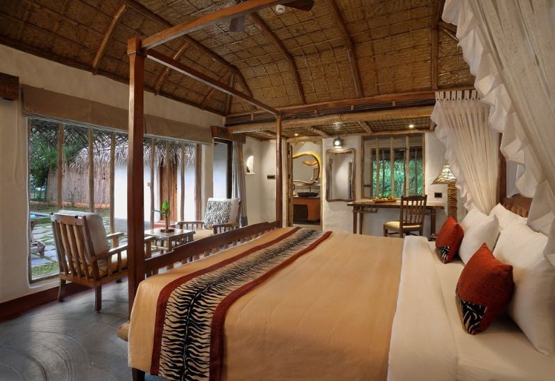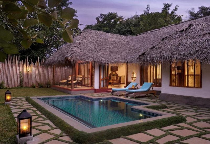 The Pool Reserve offers expansive living and dining spaces, a private courtyard with a heated pool, and a distinctive Star Bed for enjoying the clear Kabini night sky.