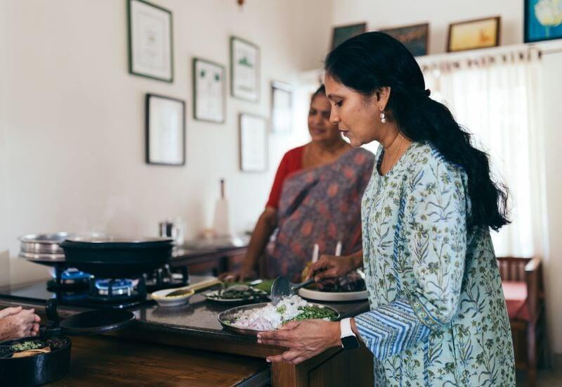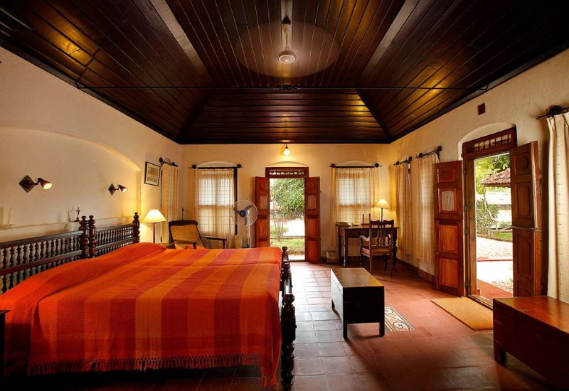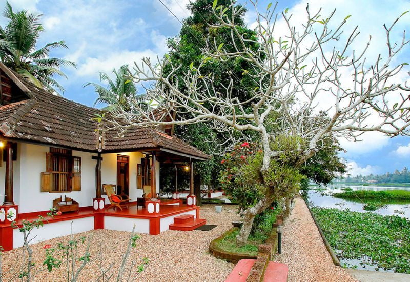 There are six Keralan-style cottages, two of which are interconnected, dotted along the waterfront offering unobstructed backwater views. Inside the rooms are simply, tastefully, artfully furnished with large beds, modern bathrooms, and outside seating. Kicking back is the order of the day here, but village walks, farm visits, and cycling jaunts can all be arranged. There is a small restaurant-cum-lounge-cum library beside the family home, in which owner Anu and her mother-in-law conduct their celebrated cooking classesa