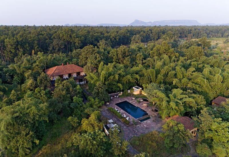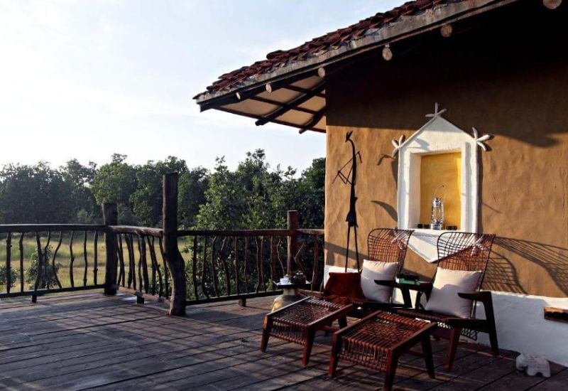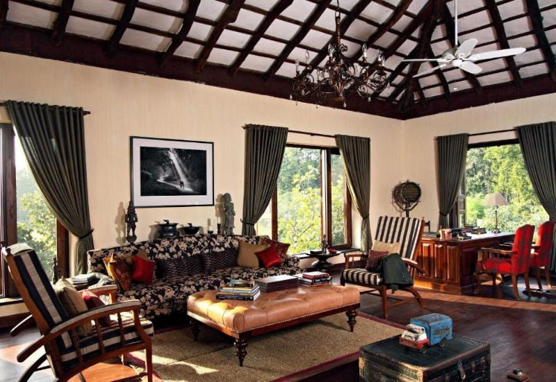 The lodge's lounge serves as its centerpiece, featuring an exquisite design with wooden ceiling beams, exposed brick walls, and two expansive wood-burning fireplaces. The presence of writing desks and photographs showcasing the wildlife and landscapes of Bandhavgarh evokes the image of past explorers returning from their safaris to document their encounters with the majestic tigers that roam the park.