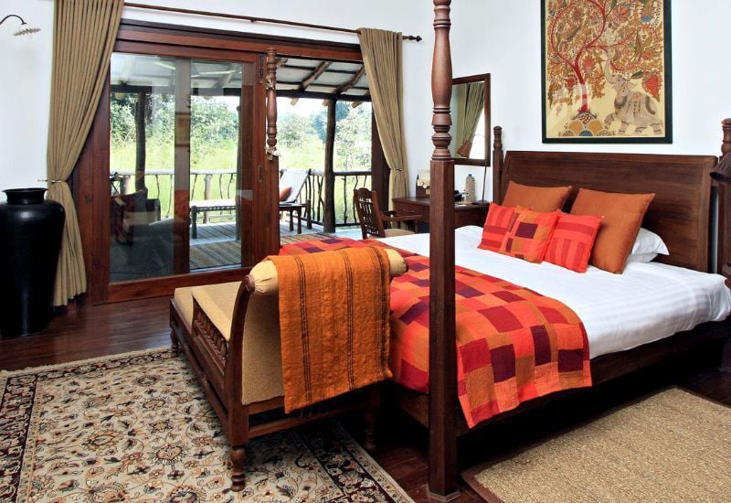 The lounge opens onto a wooden deck that overlooks the lodge and its twelve private villas. Each villa is equipped with a spacious lounge and a bedroom adorned with a four-poster bed, complemented by Indian artifacts, artwork, and textiles. The en-suite bathrooms are fitted with a rolltop bath and a separate shower, along with an outdoor bathing area featuring a sunken bathtub and shower, ideal for warm summer evenings. A private verandah furnished with daybeds and a table and chairs invites guests to immerse themselves in the serene surroundings. Guests can cool off in the outdoor pool and Jacuzzi, relax in one of the cabanas, or visit the gym, and those seeking relaxation can indulge in treatments at the serene spa.