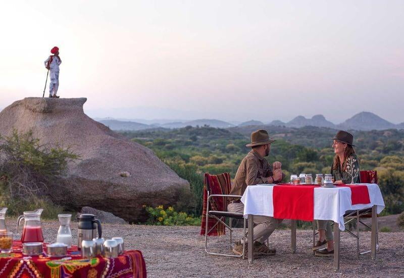 Additionally, visitors can tour nearby temples and forts, ride mountain bikes to uncover the landscape, or unwind with yoga sessions in tranquil settings. Conclude your day with sundowners before gathering in the dining tent or around the fire to witness meals being prepared in the live kitchen.
