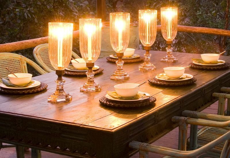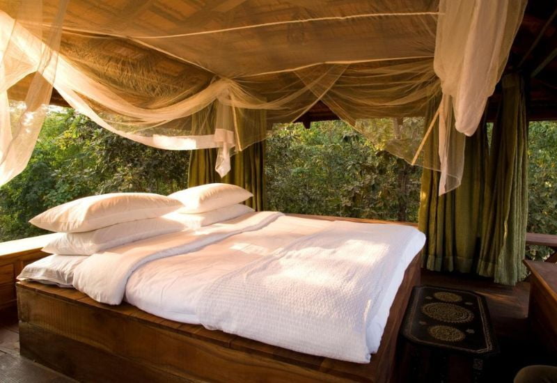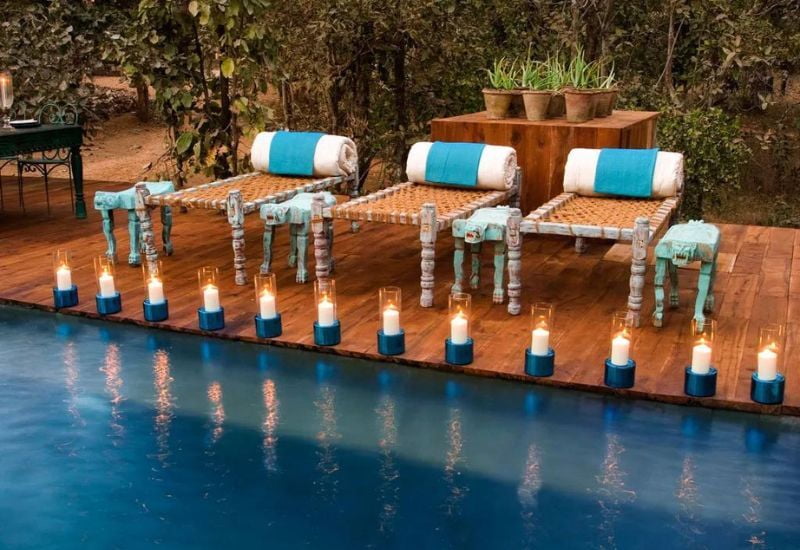 Guests can ascend stairs to a covered platform, or 'machan,' which offers a panoramic view of the treetops. Each bungalow is equipped with both indoor and outdoor showers, a living area, and a well-stocked bar. While the primary attraction is the opportunity to observe wildlife, guests can also enjoy a refreshing swim in the pool that overlooks the stream and savor authentic central Indian cuisine at the on-site restaurant.