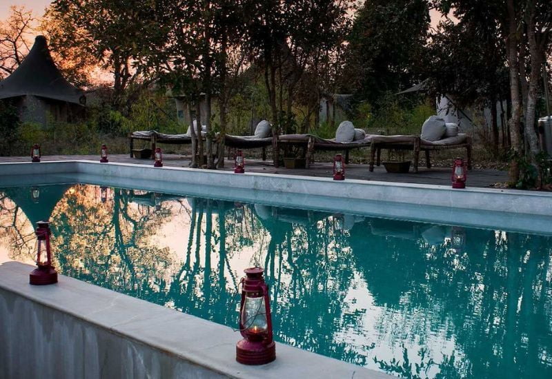Guests can savor delectable regional cuisine on the expansive dining decks or within the enchanting sal forest illuminated by lanterns. Additionally, the camp boasts a swimming pool for wildlife observation and a library for further exploration between the twice-daily game drives.