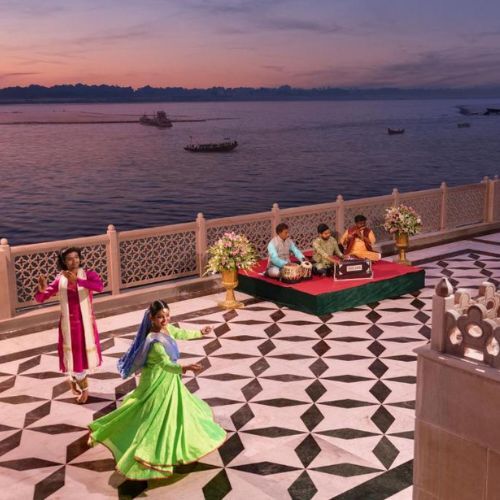 The beautifully adorned central atrium serves as a delightful space for daytime relaxation and hosts live classical music or dance performances in the evenings. Dining options are equally appealing, with a stunning dining room that overlooks the Ganges and a quaint courtyard dining area, both offering delectable local cuisine and a variety of international dishes, though it is exclusively vegetarian and alcohol-free due to its sacred location on the holy Ganga. The charming Kashi wellness Spa provides a range of Ayurvedic treatments in its inviting treatment rooms.