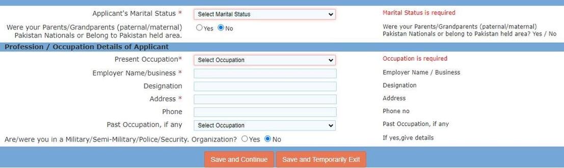 You need to provide your family information (Mother and Father’s details) as well as your profession, occupation and marital status.