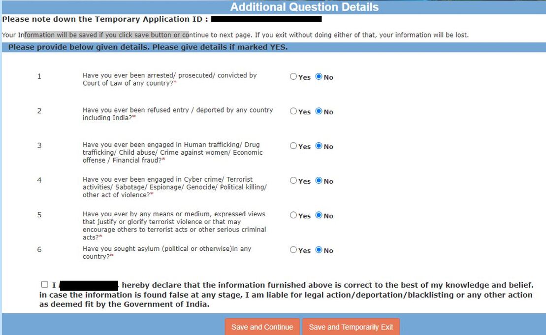 This page requires information about your travel plans in India including your expected Port of Arrival, planned Port of Exit and places you have previously visited in India.