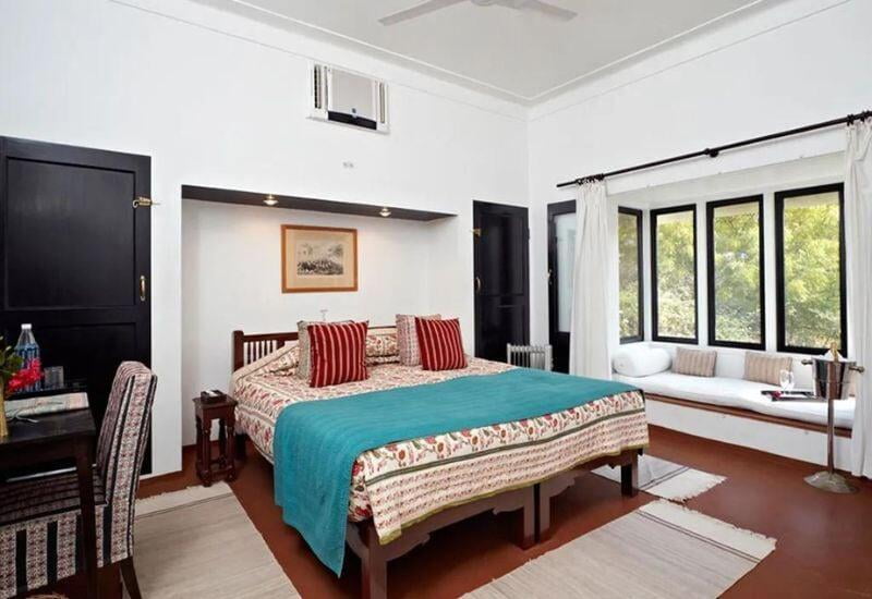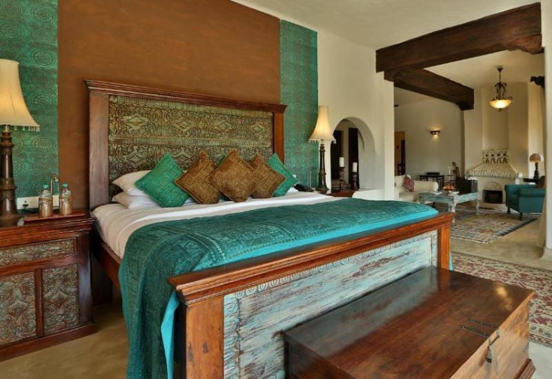 Guests can choose from six accommodations: two luxurious suites and four deluxe rooms, along with six spacious and airy Rajasthani tents situated in a courtyard beneath the fort's ramparts. The luxury suites boast private terraces with stunning countryside views, cozy sitting areas, a fireplace, and an open-air bathtub and/or shower, all adorned with bespoke furnishings. The deluxe rooms, while slightly smaller and opening onto a courtyard, offer the same level of comfort and amenities as the suites, along with impressive views. Interconnecting deluxe rooms are available for those seeking additional space. The tents, located in a landscaped courtyard beneath the ramparts, provide a playful alternative to the indoor rooms, each equipped with ensuite shower facilities and seating areas both inside and outside.