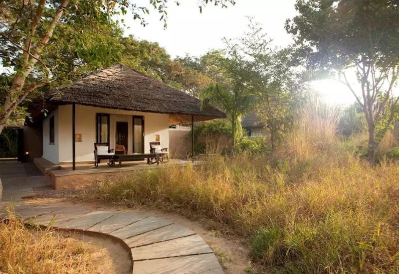 At Khem Villas, one can frequently observe jackals, jungle cats, hyenas, desert foxes, and crocodiles within the expansive 10 acres of adjacent grasslands. The establishment features a collection of cottages and tents, each equipped with a private terrace. The eight independent luxury cottages are both spacious and comfortable, boasting outdoor showers, large private courtyards, and verandas.