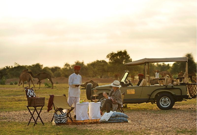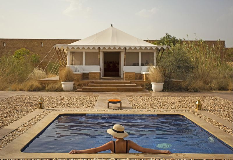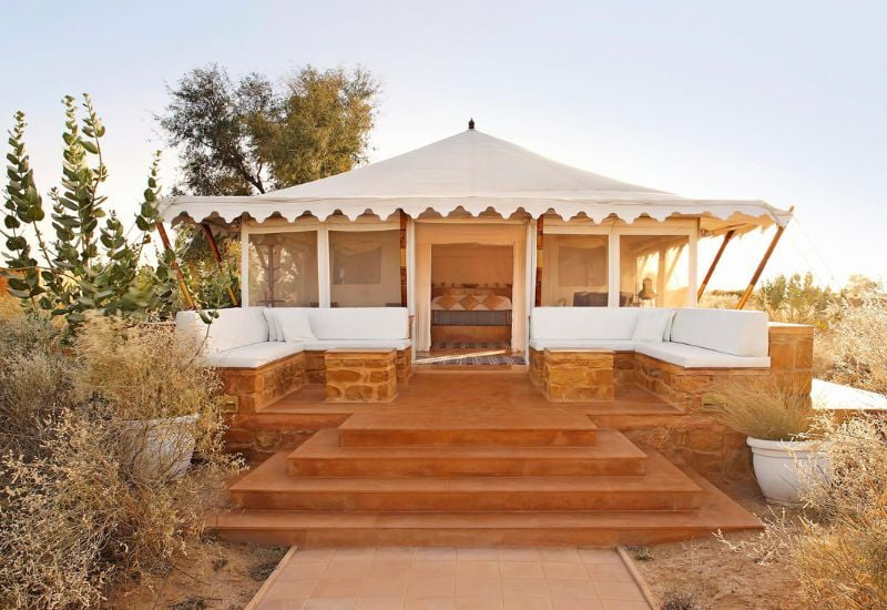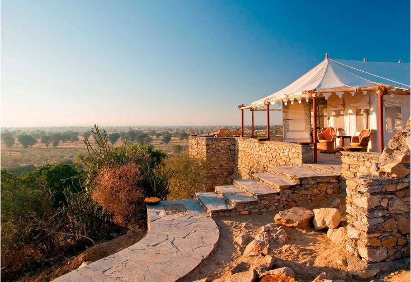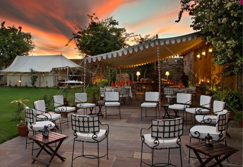 Within this tranquil retreat, the SUJÁN spa provides treatments amidst secluded gardens. At the Dining Tent restaurant, savor local specialties alongside Western cuisine, featuring daily rotating menus crafted from fresh ingredients. The captivating setting creates an ideal atmosphere to enjoy the mesmerizing performances of the legendary Manganiyars musicians.