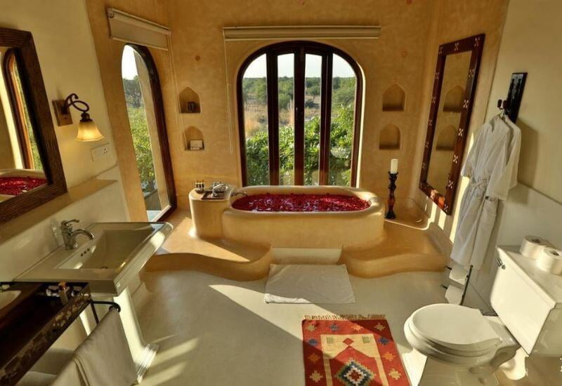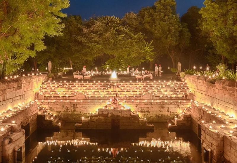 Guests can savor delectable regional cuisine crafted from fresh, seasonal local ingredients. Dining al fresco under the moonlight is a remarkable experience, and enjoying sunset cocktails on the rooftop is highly recommended. Massage services can be arranged, and an outdoor jacuzzi is situated on a turret. A variety of activities are offered, including village walks, boating, camel cart rides, and cooking classes.